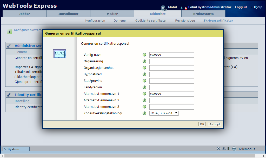For å generere en sertifikatforespørsel, følg prosedyren nedenfor.