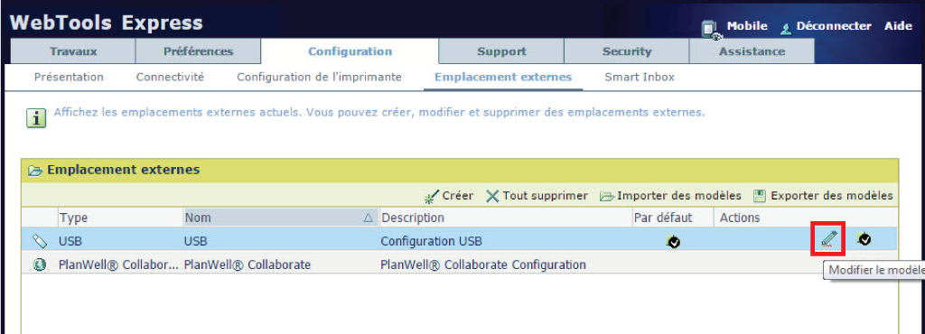 Lorsque vous envisagez d'utiliser une clé USB comme emplacement, vous devez configurer au préalable les paramètres correspondants. Vous pouvez configurer ces paramètres dans WebTools Express.