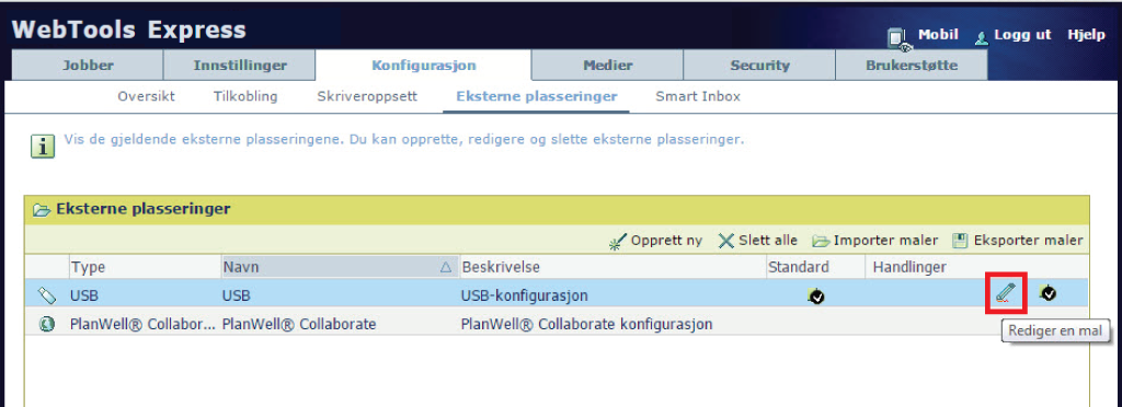 Hvis du vil bruke USB som en plassering, må du først angi innstillinger for USB. Du kan angi innstillingene i WebTools Express.