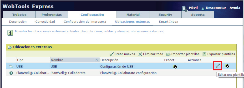 Para poder utilizar una ubicación USB debe definir los ajustes correspondientes. Puede definir los ajustes en WebTools Express.