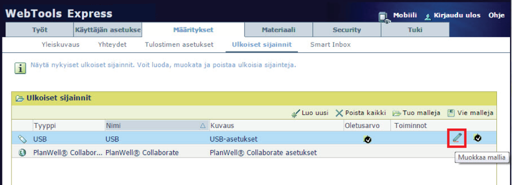 Kun otat käyttöön USB-sijainnin ja laitat USB-tikun ohjauspaneelin asemaan, ulkoista USB-sijaintia voi käyttää ohjauspaneelin kautta ja WebTools Express -sovelluksesta.