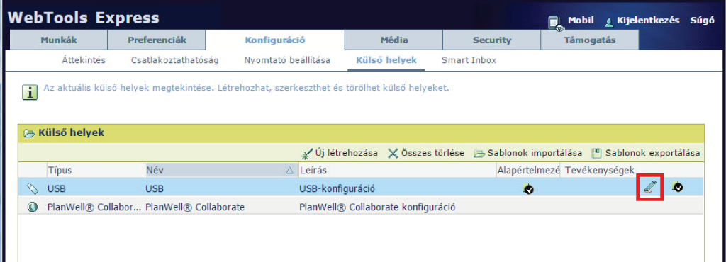 Amikor az USB-t helyként kívánja használni, először beállításokat kell végrehajtania az USB számára. A beállításokat az WebTools Express alkalmazásban végezheti el.