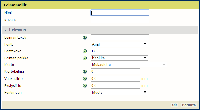 Voit ottaa käyttöön leimaustoiminnot kohdan [Kopiointityön oletusasetukset] mukautetun mallin osassa WebTools Express -sovelluksessa. [Leimaus] -välilehdeltä voit luoda oman valmiiksi määritetyn leiman.