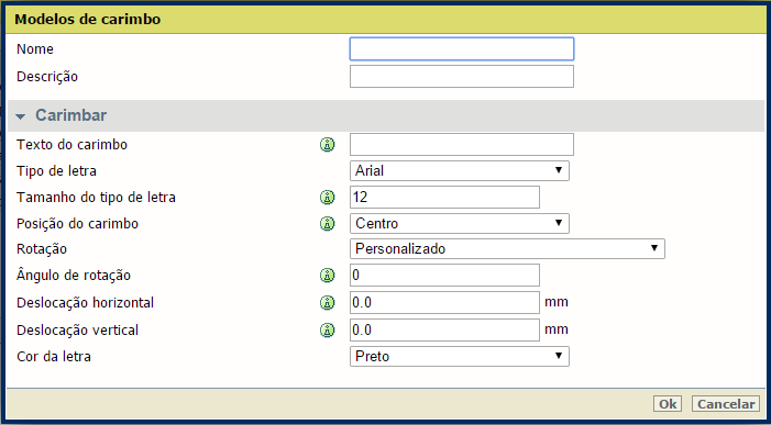 Introduza o [Texto do carimbo] que irá aparecer no carimbo. Se introduzir texto, escolha também a [Tipo de letra] e o [Tamanho do tipo de letra].