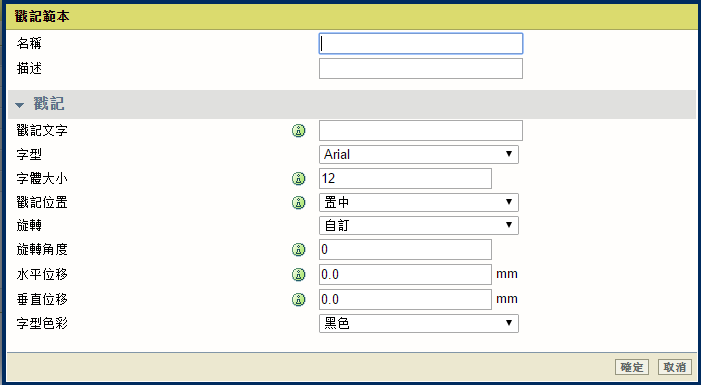 您可以在 WebTools Express 中的 [複印工作預設值] 自訂預設區段啟用戳記功能。您可以在 [戳記] 標籤中建立自己的預先定義戳記。
