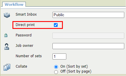 [기본설정] - [시스템 기본값] -[작업 관리] - [인쇄 작업의 대상 위치 재정의] 이(가) [예, 다음으로만 보냄 Smart Inbox] (으)로 설정된 경우 직접 인쇄할 수 없으며, 프린터에서 인쇄 작업을 시작해야 합니다. 직접 인쇄로 인쇄하려면 WebTools Express.에서 이 설정을 변경해야 합니다.